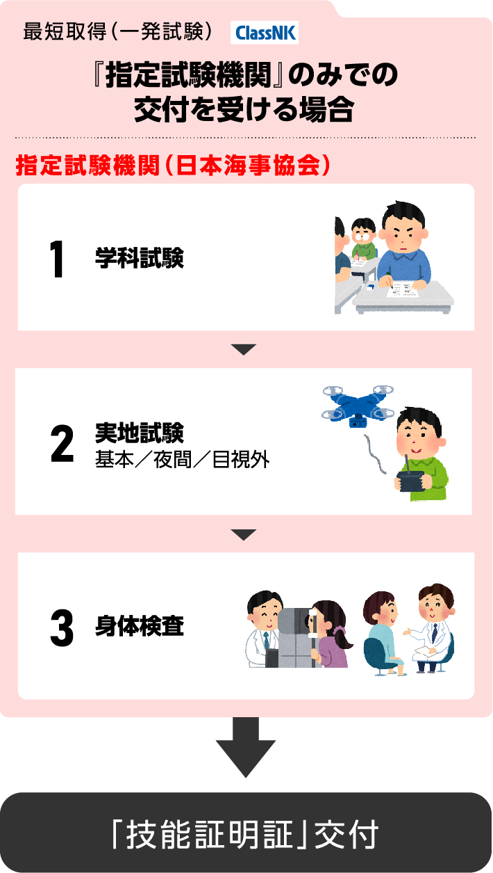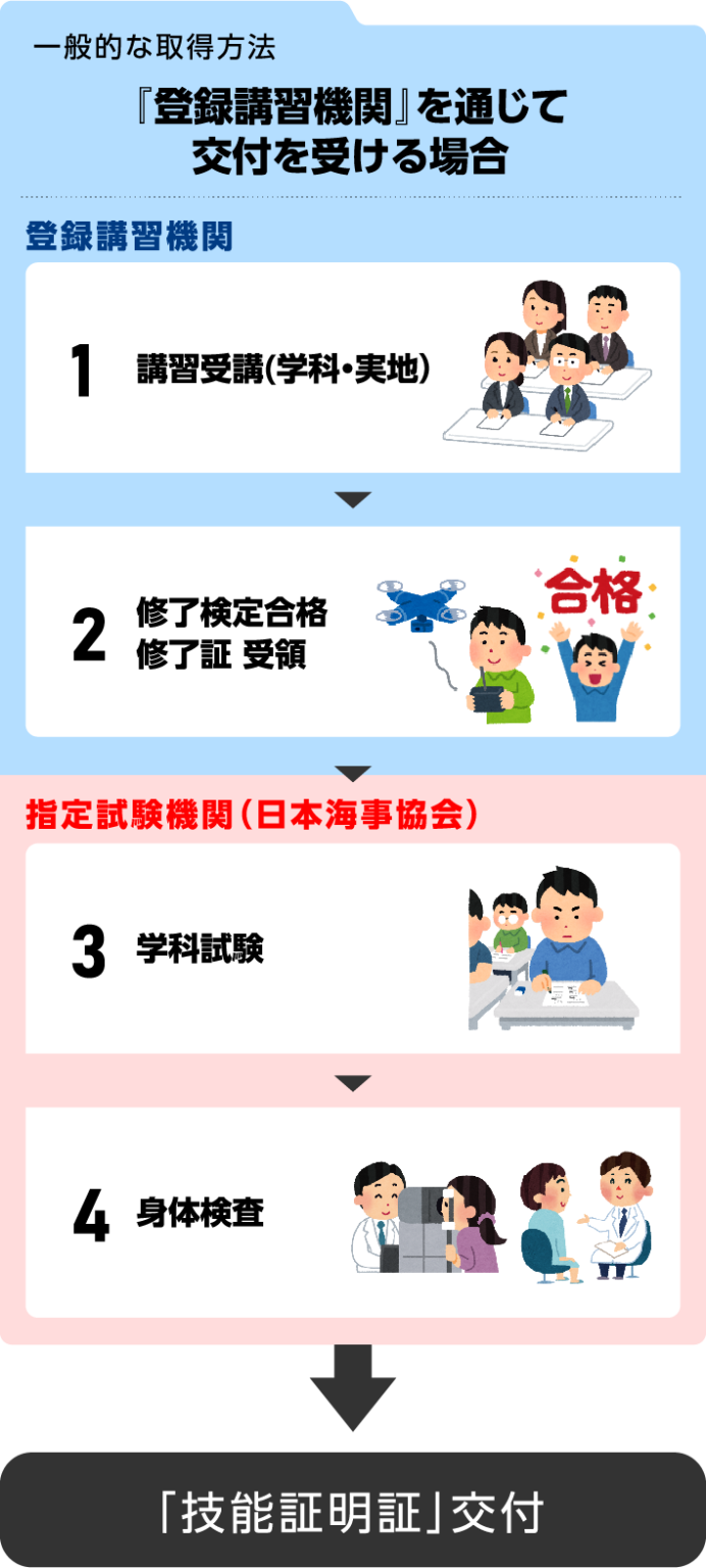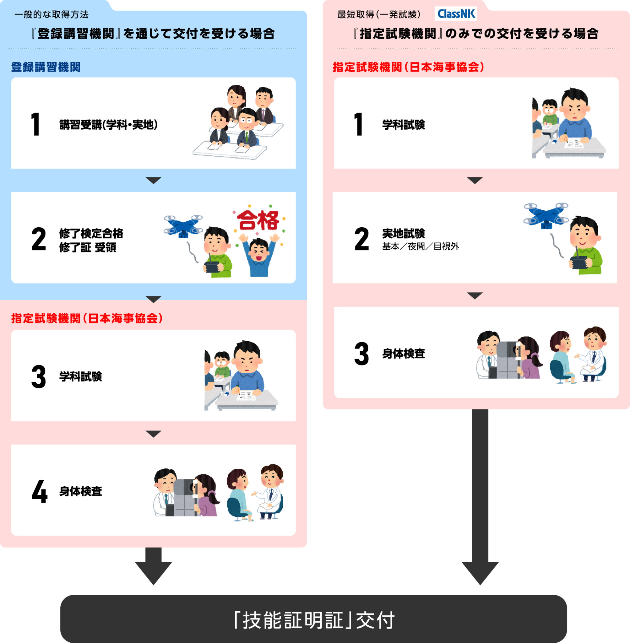 一等・二等無人航空機操縦士の取得は、登録講習機関(ドローンスクール)に通い学科・実地の指導を受ける方法と、指定試験機関(日本海事協会)で直接試験を受験する方法に分かれます。